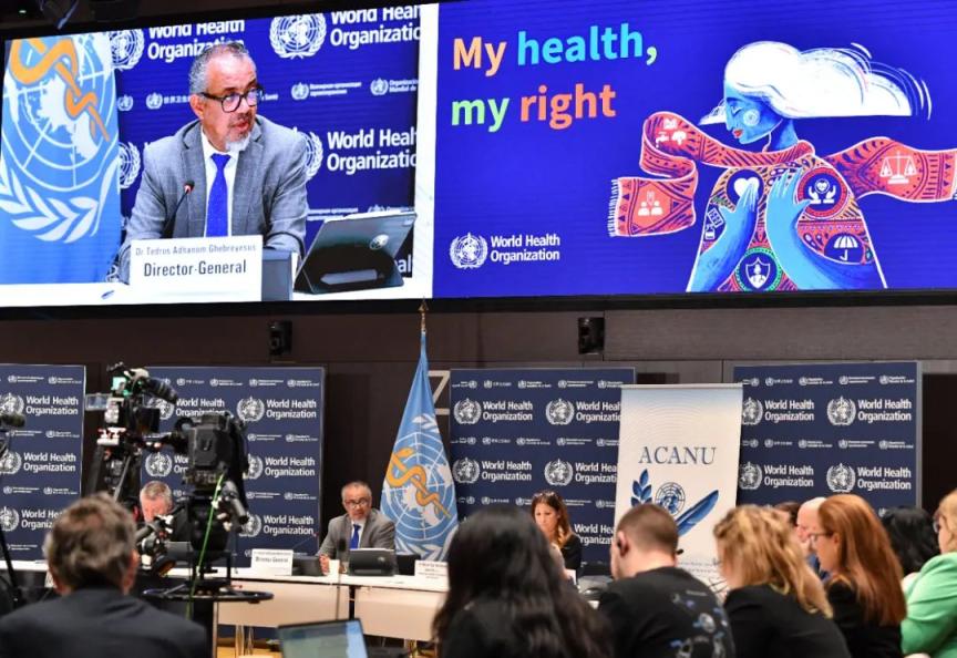 2024年12月10日,世界卫生组织总干事谭德塞在瑞士日内瓦世卫组织总部出席年度新闻发布会并讲话。