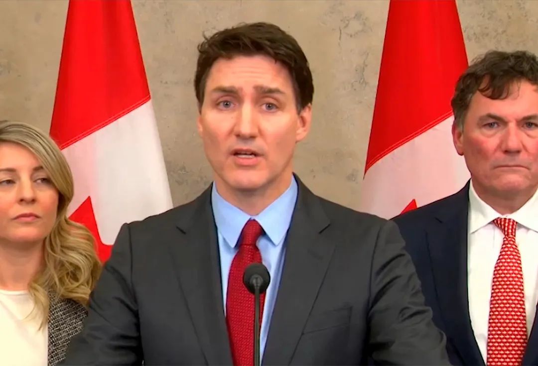 2月1日,加拿大总理特鲁多(中)在渥太华接受媒体采访(视频截图)。