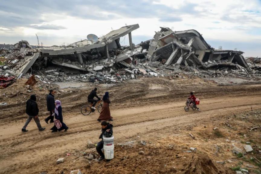 2月9日,在加沙地带内察里姆走廊附近,巴勒斯坦人经过建筑废墟。